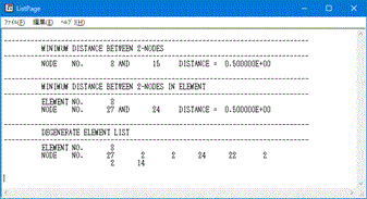 また、つぶれた(縮退した)要素が存在していると、その情報(DEGENERATE ELEMENT LIST)も出力されます。